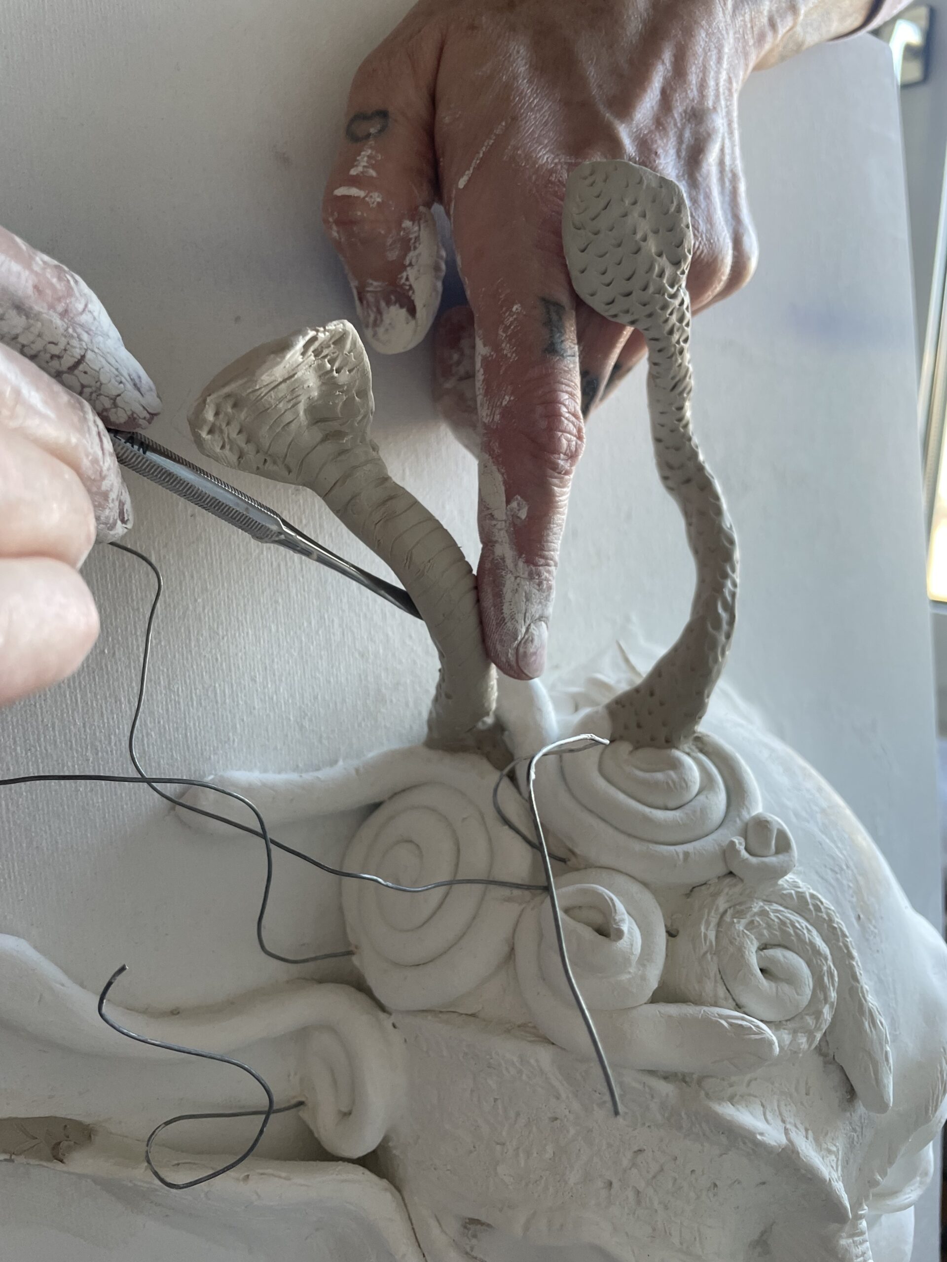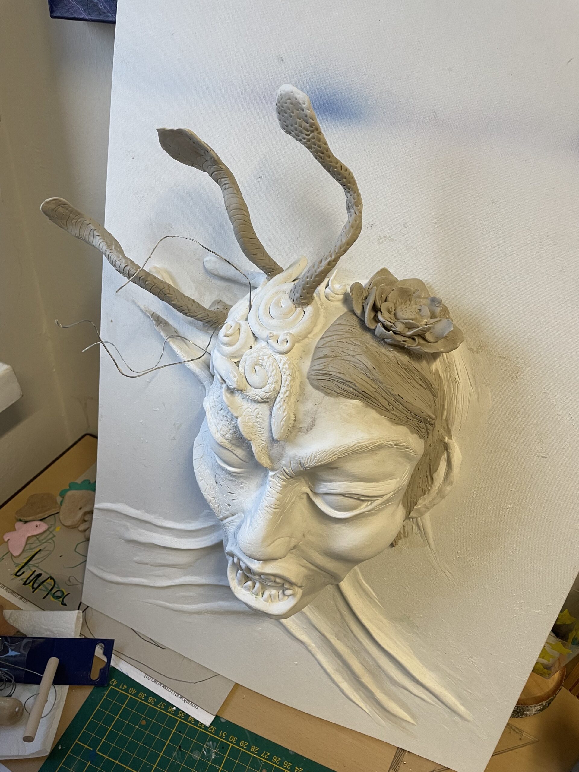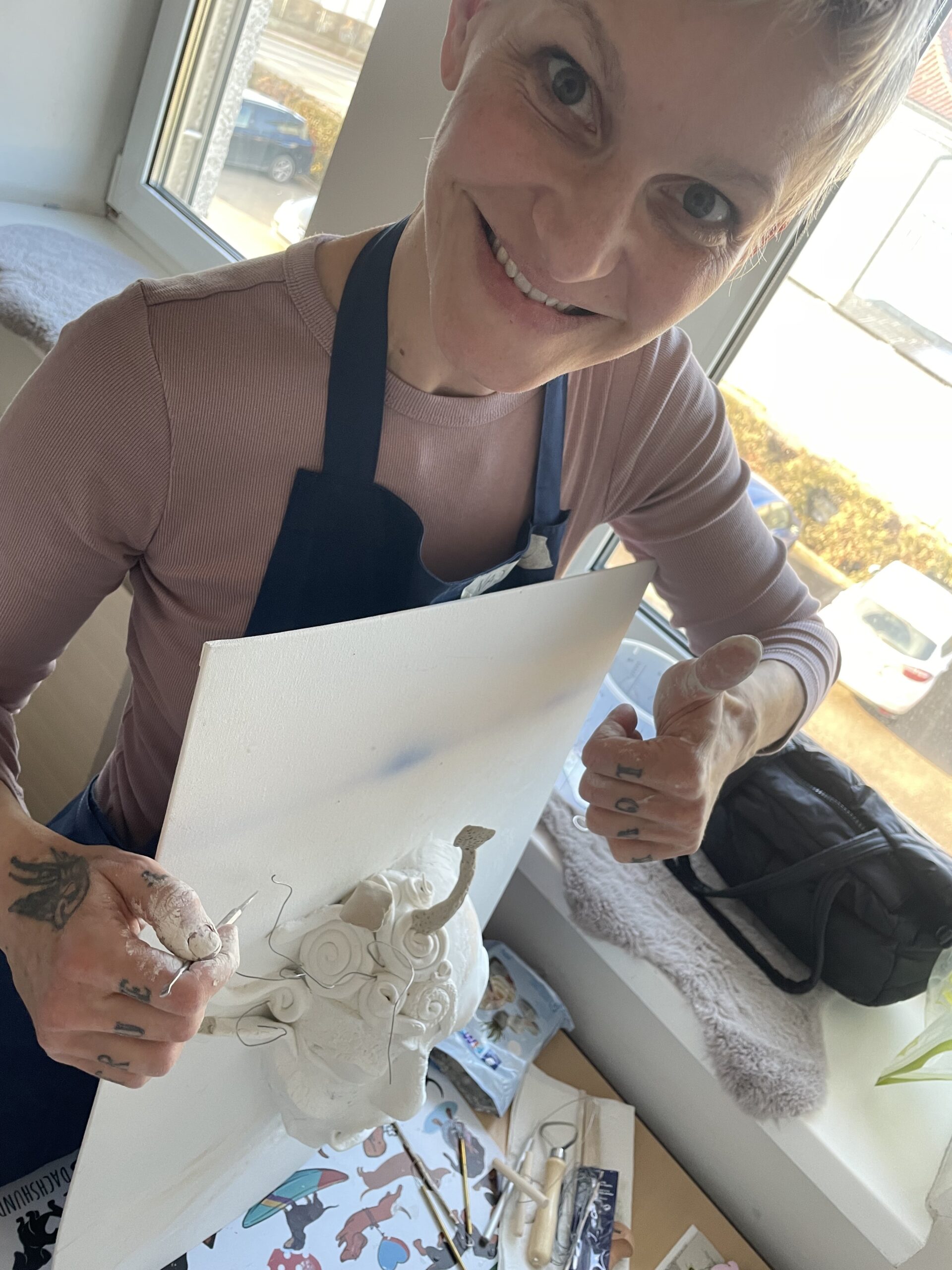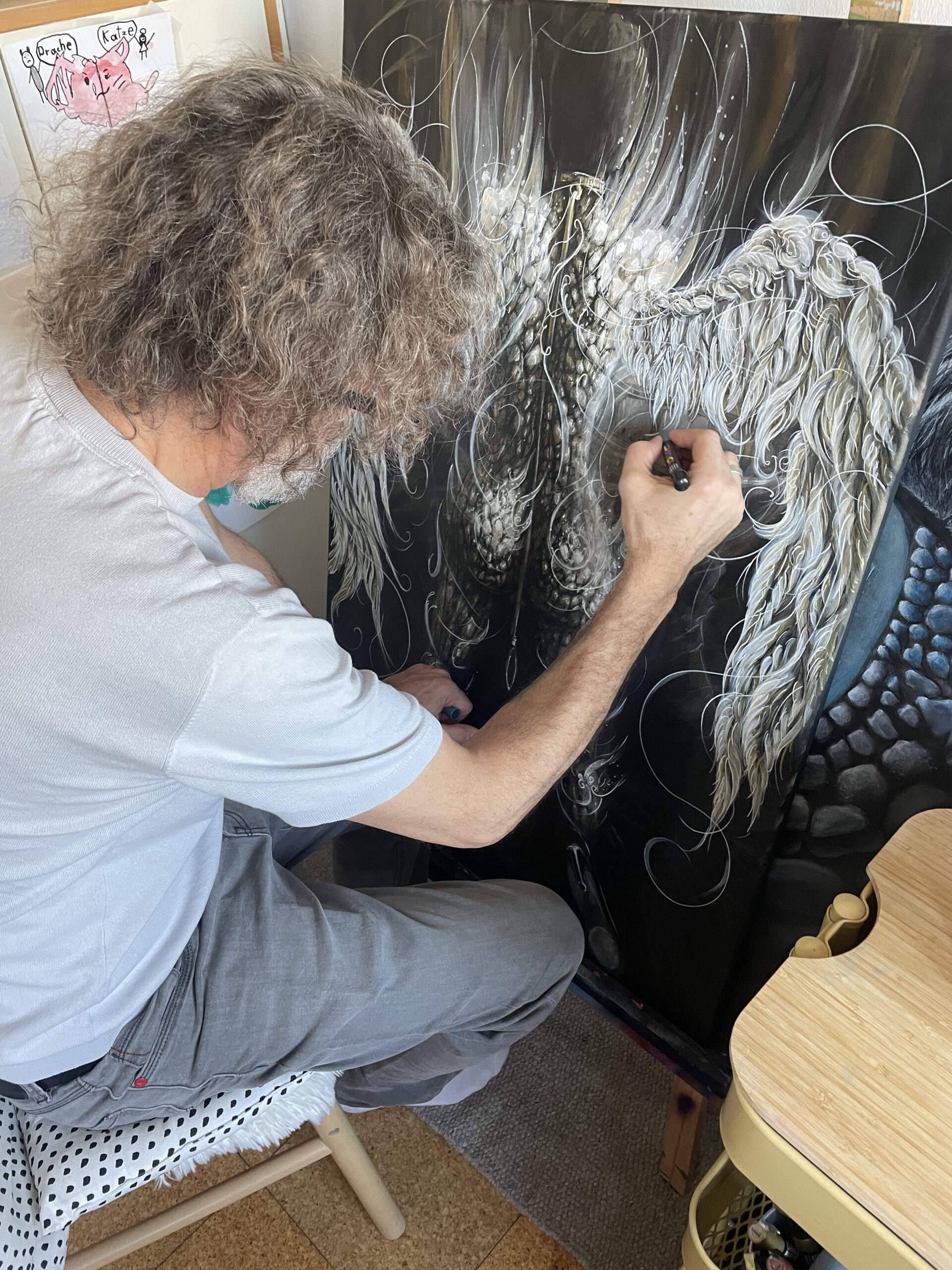 Nach einer echt anstrengenden Siedelwoche haben wir uns heute mal einen Tag Pause vom Chaos im Atelier gegönnt. Nadin hat endlich wieder einmal an ihrer „Medusa“ gearbeitet und ich habe an den Flügeln von Nadin weitergemalt. Angekommen!